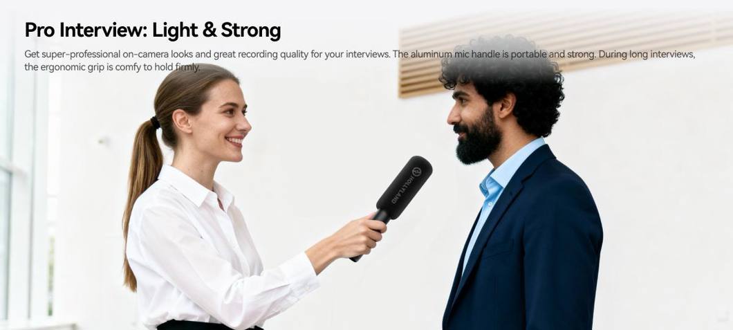 Turn your wireless transmitter into a professional handheld interview microphone in seconds. The Hollyland Interview Adapter features a durable aluminum handle that provides a comfortable grip and a classic reporter-style appearance, making it ideal for interviews, podcasts, livestreams, and on-location reporting