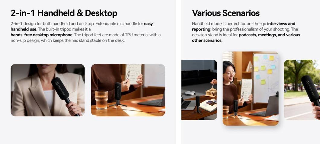 Thanks to its versatile 2-in-1 design, the adapter can also function as a desktop microphone stand. Simply unfold the integrated tripod feet and place it on a table for hands-free recording during podcasts, interviews, meetings, or panel discussions.